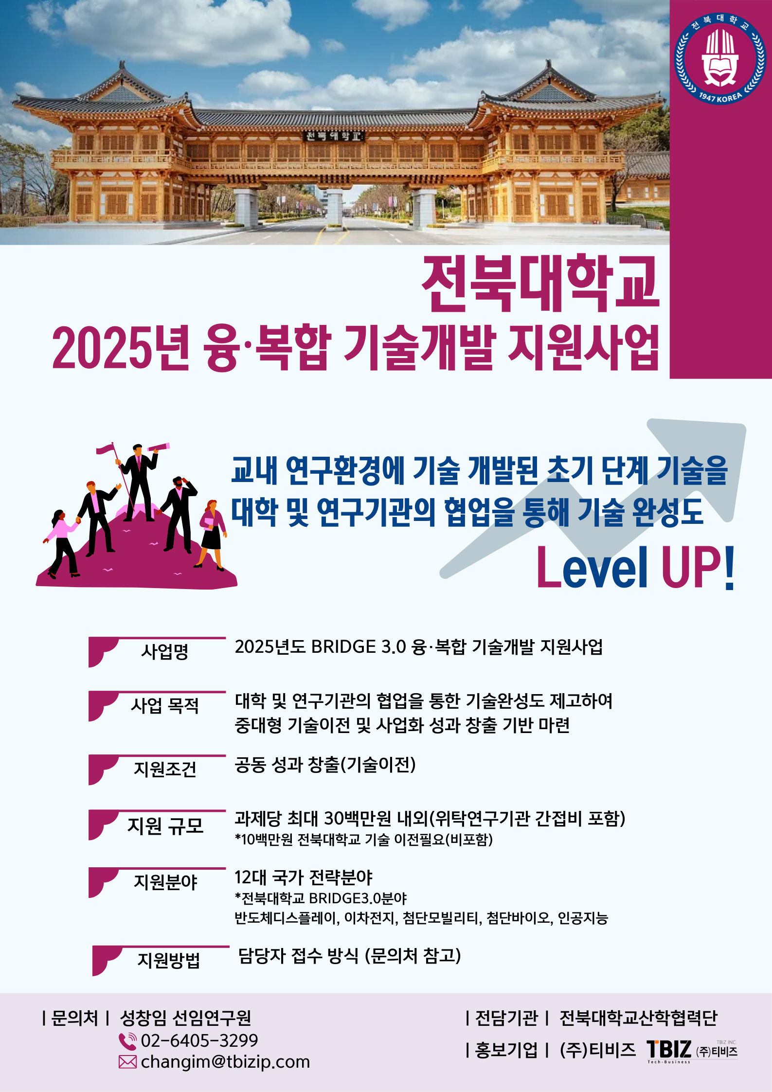 『전북대학교 BRIDGE 3.0사업』융·복합 기술개발 지원 운영을 위한 협력기관을 다음과 같이 모집합니다.